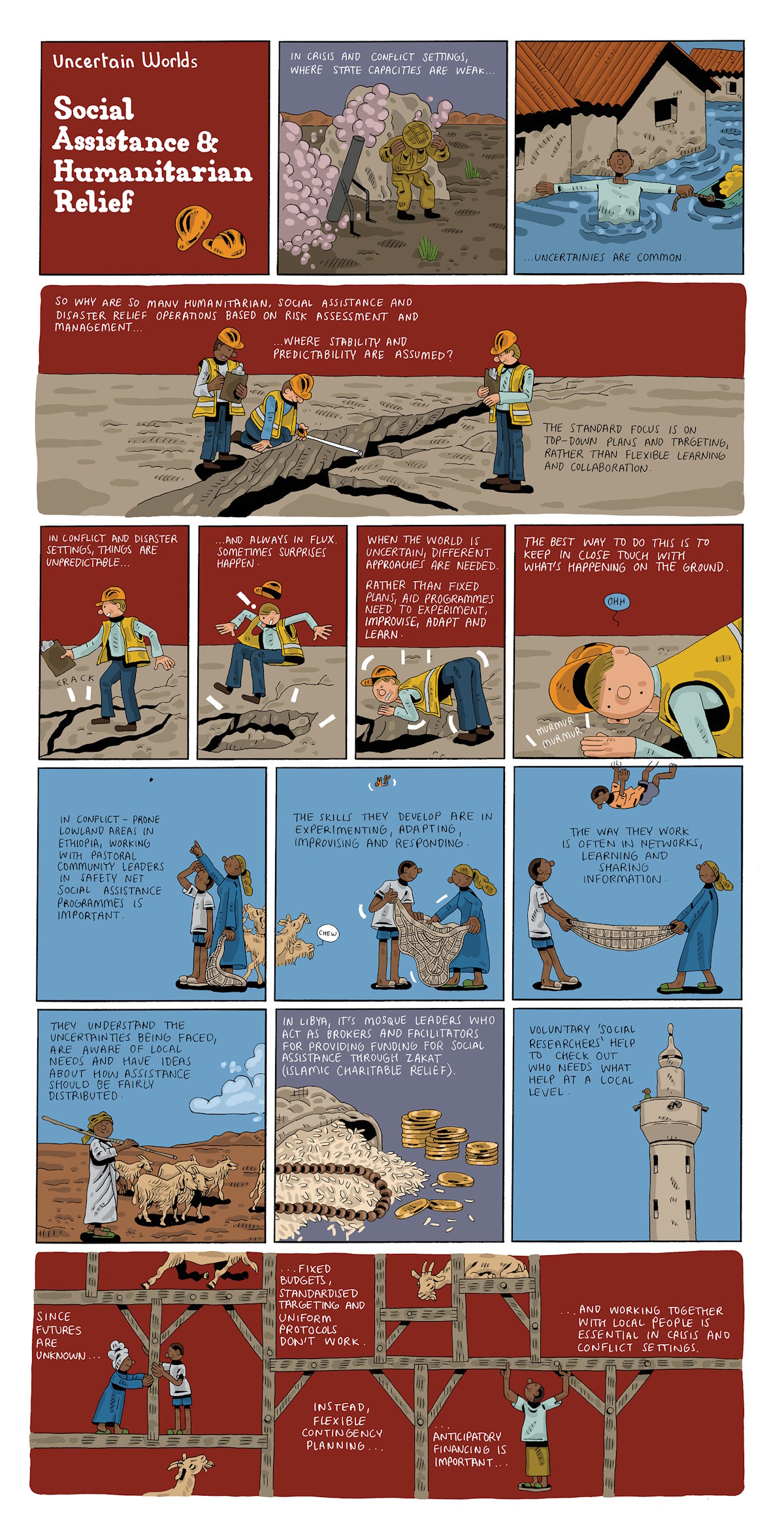The fifth comic in our ‘Uncertain Worlds’ series focuses on how social assistance and humanitarian relief are provided in the context of conflicts, crises and disasters.