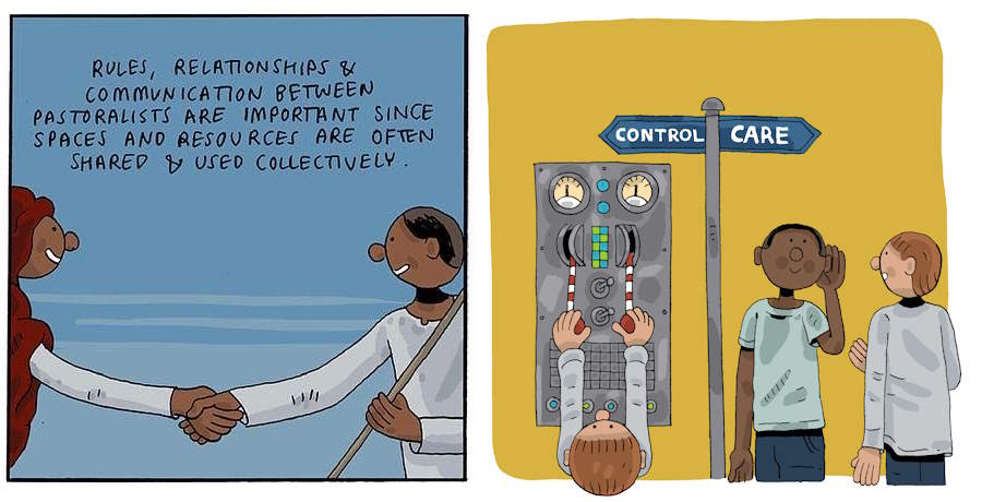 Our Primer on Pastoralism, produced together with the Transnational Institute (TNI) and the World Alliance for Mobile Indigenous Peoples (WAMIP) and available in multiple languages, also provides a good overview of the key themes and arguments, aimed at activists and others engaging with policy change. A paper in the journal Social Anthropology – along with our series of comics on the theme of ‘Uncertain Worlds’– suggests a contrast between a mainstream narrative focused on ‘control’ and a new narrative centred on ‘care’.