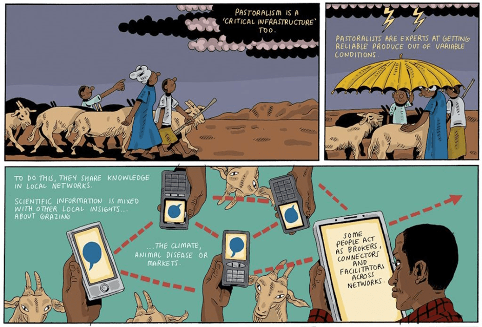 This is why thinking about resilience – in relation to climate and other shocks – through the perspectives of pastoralists is essential if appropriate policies are to emerge. Variability in environmental, climate, market, political, and other conditions affects all pastoralists. Living with and from variability is central to pastoral livelihoods, as was discussed in our Pastoralism Primer and open-access book, as well as our paper and associated comic on social assistance and humanitarian response in pastoral areas.